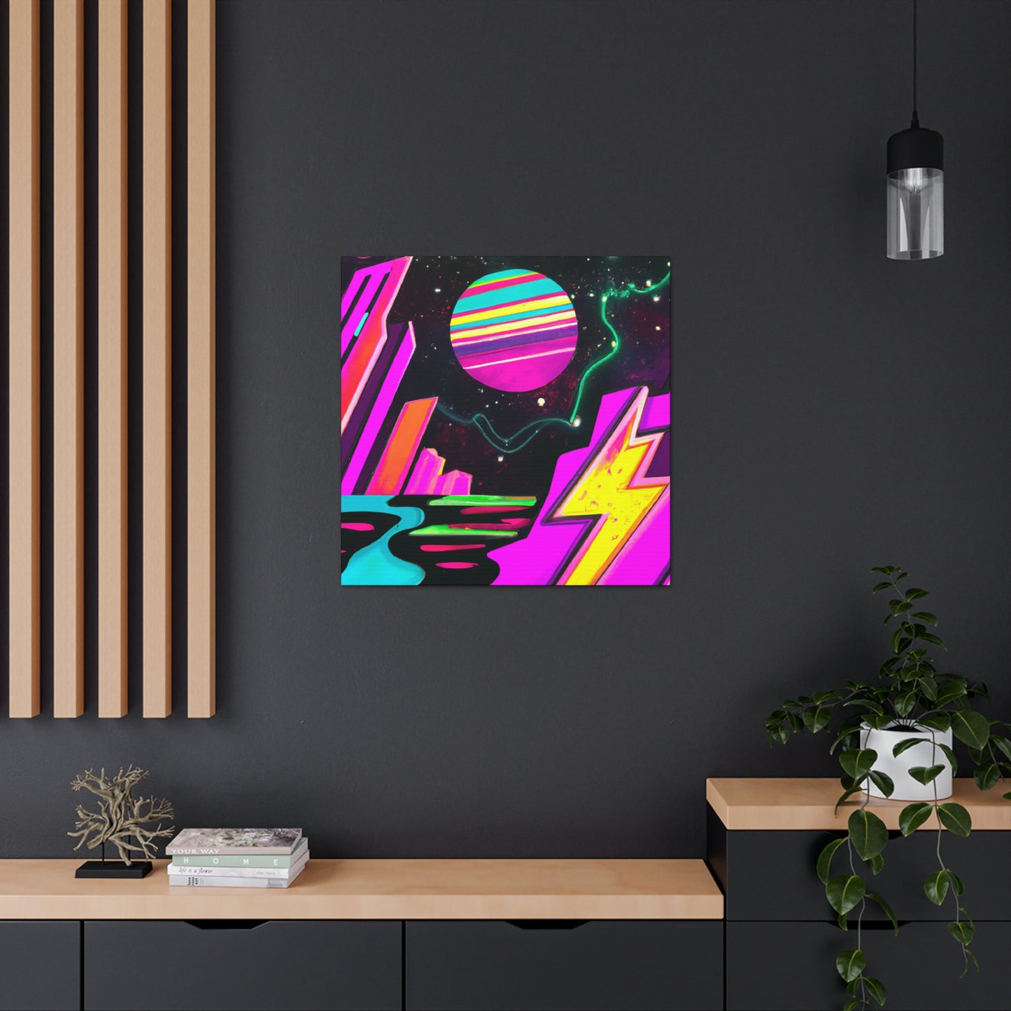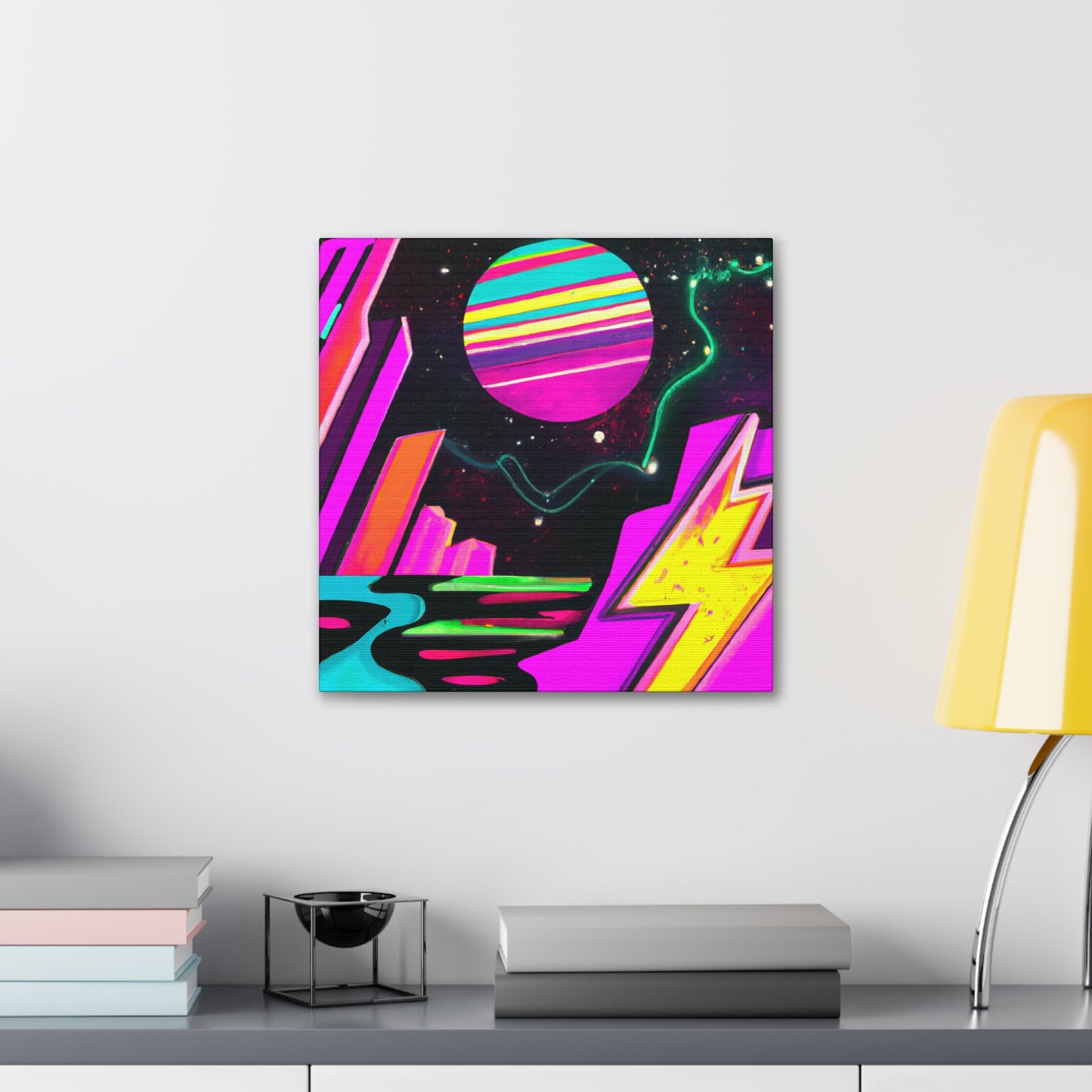This abstract painting brings an inspiringly modern take on the 80s style, with digitally reinterpreted neon-color blocks. The exciting energy of the artwork will bring your living space to life! Perfect for smaller apartments, the canvas makes a great centerpiece and instantly sets the mood. #neonart #80s #abstractart #canvasart #vibrant #modern #digitalart #painting #interiordesign #apartments #80sart